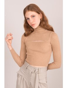 Fashionhunters BSL Камилско оребрено поло с изрезка