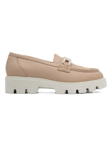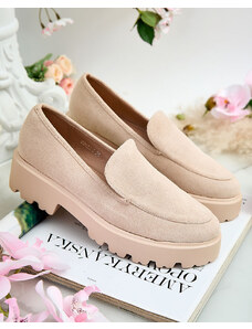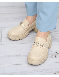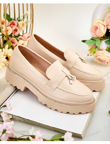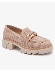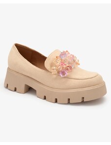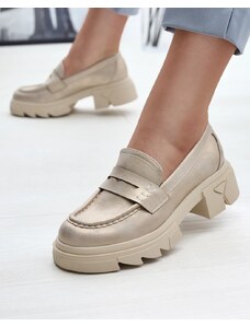 Beautiful women's moccasins on a low wedge. The model has a casual style and is made of eco-friendly leather with a natural leather insole. The toe is rounded and adorned with gold elements featuring rhinestones. An ideal base for many everyday outfits